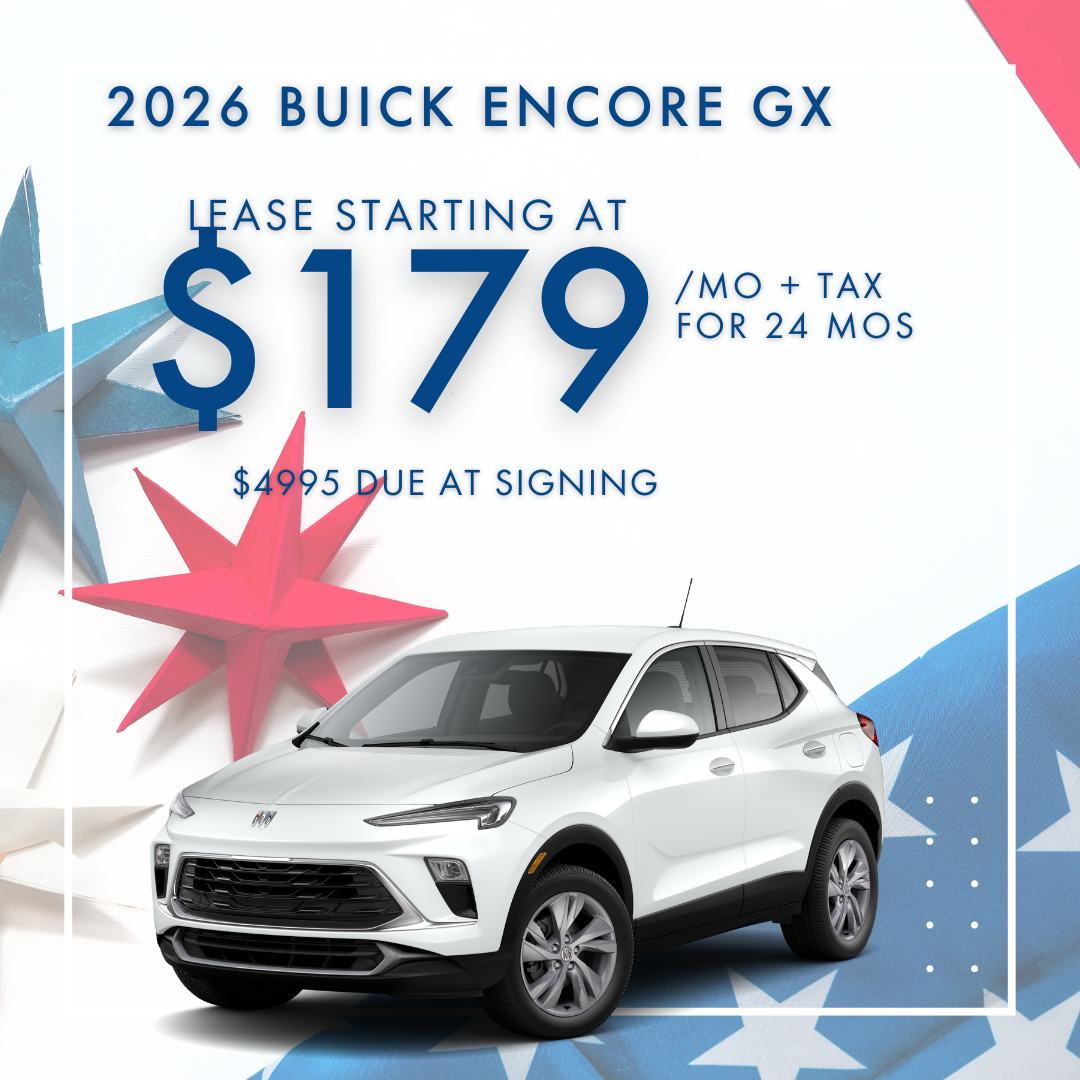 Lease based on 2026 BUICK ENCORE GX PREFERRED (STOCK #B72778 MSRP of $31,290 - $5869 customer cash down including $179 first monthly payment $695 acquisition fee, plus taxes, titles, license and documentary service fees. No security deposit required for Tier 1. $1500 BUICK GMC LEASE REBATE INCLUDED IN THE OFFER. (must have a CURRENT BUICK OR GMC lease in the household. if not $1500 must be put down to match the offered monthly). Lessee is responsible for $.25 per mile over 10,000 miles/year, excess wear, and a $495 termination fee. Offer Expires 03/04/2026. NEW