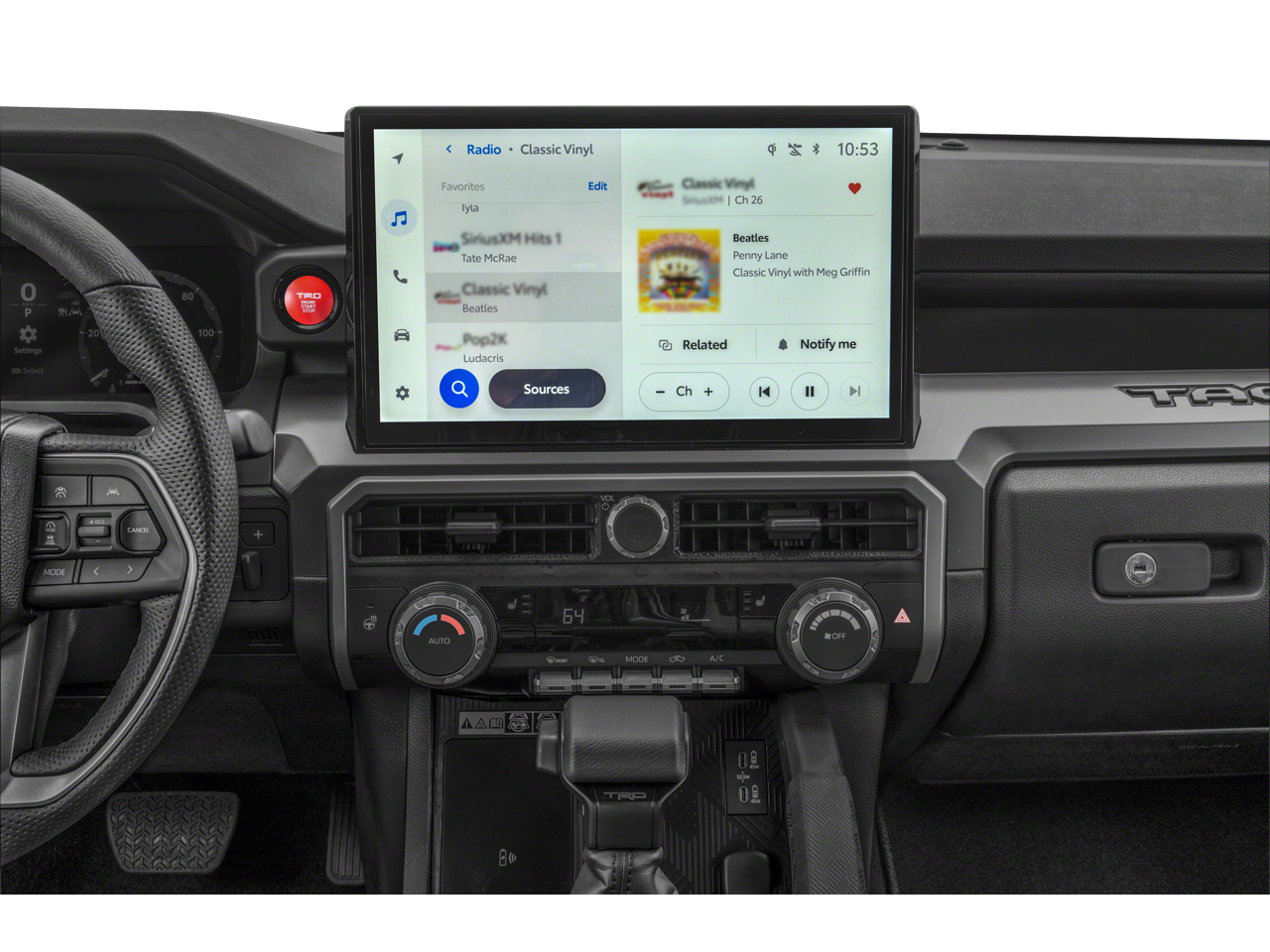 This 2025 Terra Toyota Tacoma TRD Offroad 4WD is well equipped and includes these features and benefits: TRD Off Road Package, Tacoma TRD Offroad, 4WD, Black Badge Overlay (TMS), Black Chrome Exhaust Tip (TMS), Black Tailgate Insert (TMS), Predator Step (TMS), 3.583 Axle Ratio, 4-Wheel Disc Brakes, 6 Speakers, ABS brakes, Air Conditioning, All Weather Floor Liners (TMS), Alloy wheels, AM/FM radio: SiriusXM, Anti-whiplash front head restraints, Apple CarPlay/Android Auto, Auto High-beam Headlights, Auto-dimming Rear-View mirror, Automatic temperature control, Bed Step (TMS), Brake assist, Bumpers: body-color, Driver door bin, Driver vanity mirror, Dual front impact airbags, Dual front side impact airbags, Electronic Stability Control, Emergency communication system: Safety Connect (1-year trial), Exterior Parking Camera Rear, Fabric Seat Trim, Four wheel independent suspension, Front anti-roll bar, Front Bucket Seats, Front Center Armrest, Front fog lights, Front reading lights, Fully automatic headlights, Heated door mirrors, Illuminated entry, Knee airbag, Leather Shift Knob, Leather steering wheel, Low tire pressure warning, Occupant sensing airbag, Outside temperature display, Overhead airbag, Overhead console, Panic alarm, Passenger door bin, Passenger vanity mirror, Power door mirrors, Power steering, Power windows, Radio: 8 Toyota Audio Multimedia, Rear step bumper, Rear window defroster, Remote keyless entry, Security system, Speed control, Speed-sensing steering, Split folding rear seat, Steering wheel mounted audio controls, Tachometer, Telescoping steering wheel, Tilt steering wheel, Traction control, Trip computer, Turn signal indicator mirrors, Variably intermittent wipers, Wheel Locks (TMS), and Wheels: 17 TRD Off-Road Alloy. Tacoma TRD Offroad, 4WD, Black Badge Overlay (TMS), Black Chrome Exhaust Tip (TMS), Black Tailgate Insert (TMS), Predator Step (TMS), TRD Off Road Package.